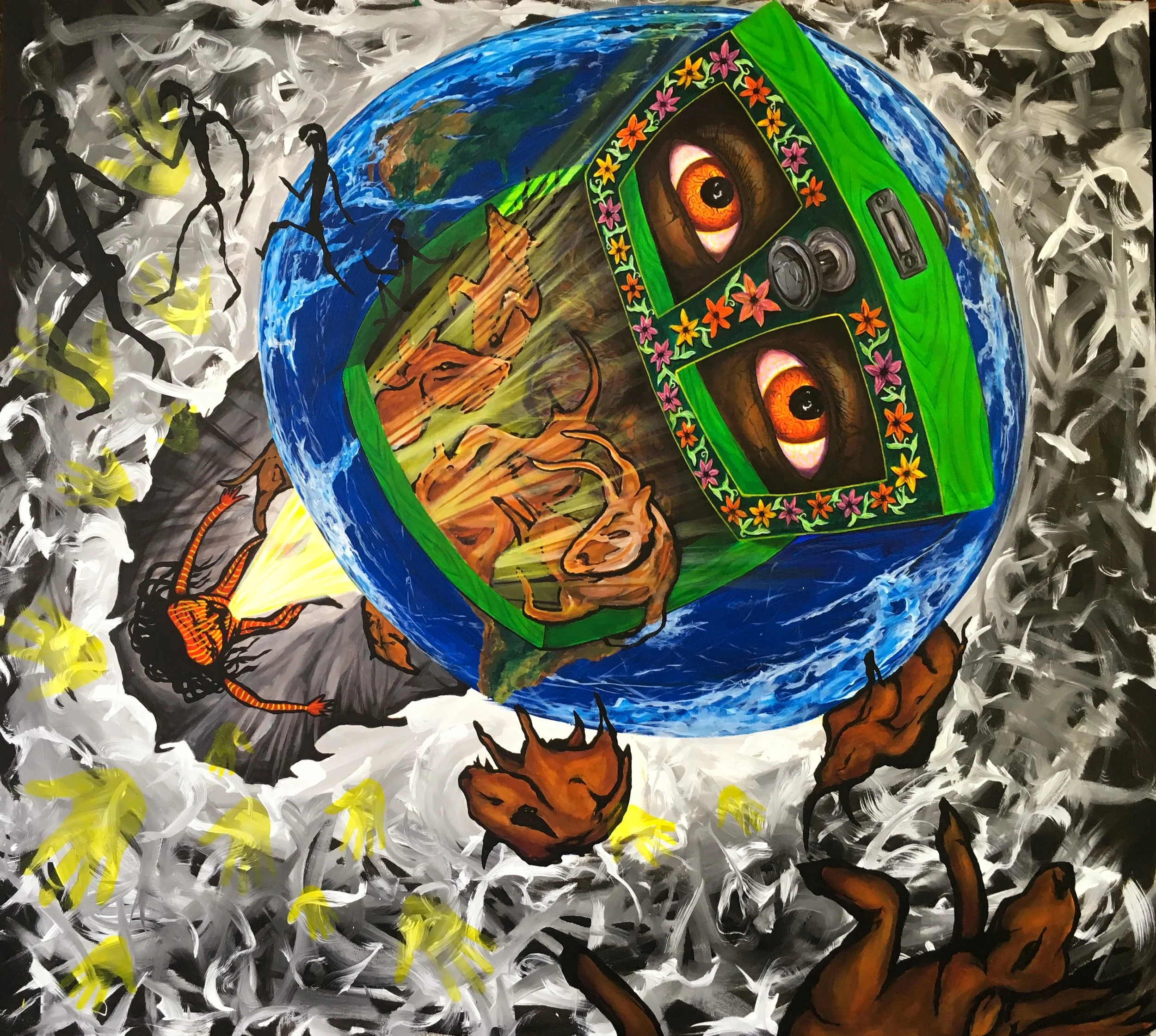 Paintings, Etc. 2022 - 2023. this piece is a painting done in the pit. this years gallery is various artworks of this last year. 5’x6’ paintings, chocolate cowboy prints, dolls, the geoglyph, my QR Code which is now the name of my gallery which takes ou to this sight, tattooing my Dad on hs 100th birthday, and more